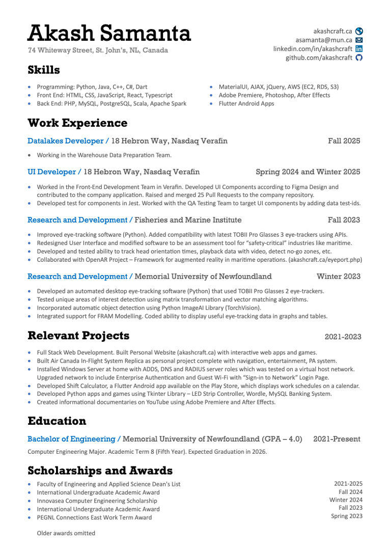 Hello! My name is Akash Samanta. I am a computer engineering student in Memorial University of Newfoundland with expected graduation in 2026. I have a strong passion for programming and love to take on new projects and challenges. I like video editing and sketching as my hobbies. Please feel free to connect with my GitHub, LinkedIn, and YouTube.